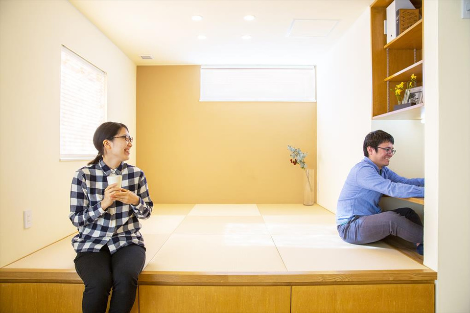 リビング横の小上がりは、ごろ寝ができるスペースがほしいというご主人と、パソコン作業を落ち着いてできるスペースが欲しいという奥さまの希望が同時に叶った、ご夫婦ともにお気に入りの空間です。畳の下はスライド式の大収納になっており、収納の心配もありません。