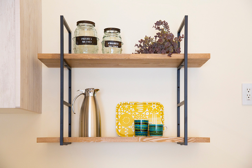 キッチン背面のアイアン・シェルフもご主人が選んだもの。この他、リビング・ドアに濃紺を採用するなど、空間に引き締め効果をもたらすインテリア・アイテムが採用されています。