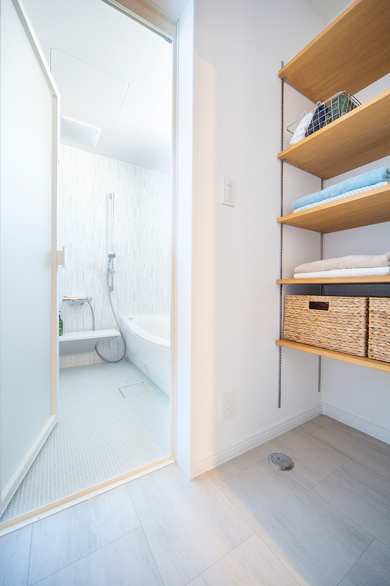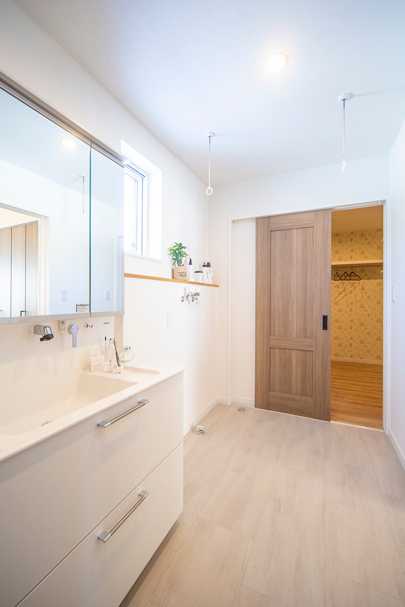 「職場の同僚のお宅を拝見して、ぜひ採り入れたいと思いました」と奥さまが話してくださったのは、キッチン奥に配された約5畳大のウォークイン・クロゼットから、4畳大の洗面・洗濯室、脱衣室、浴室が一直線に並ぶ水回り・収納空間。平屋の暮らしをサポートする大きめの収納が水回りと隣接し、出勤時の動線に優れた間取りになっています。