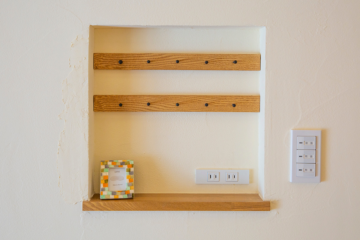 リビング・ドアと小上がりを結ぶ壁面には、キー・ニッチがあり、スマホの充電もできるよう、コンセントも設置されています。
