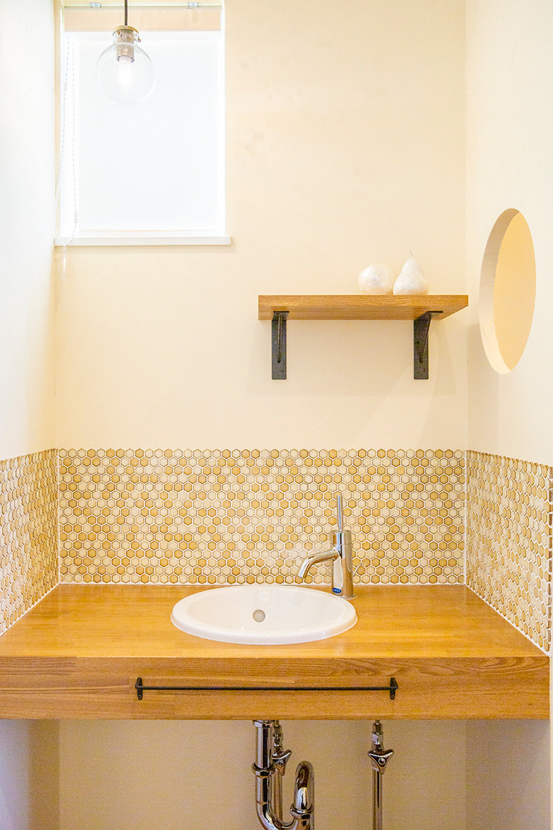 玄関ホールには手洗い用の洗面台を造作しています。玄関から見えないようにと設けられた仕切り壁には丸窓が付いています。六角形のタイルや丸いガラスのランプなど、奥さま好みの優しい雰囲気に仕上がりました。