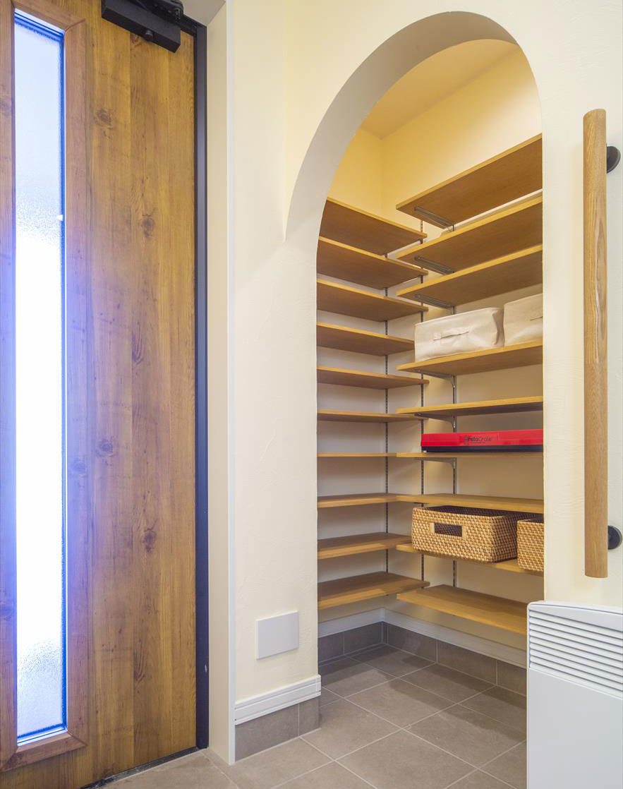 シューズ・クロゼットの出入り口はアールの下がり壁に。毎日の靴選びも気分が上がりそうです。